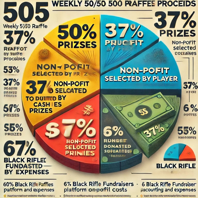 7% Black Rifle Fundraisers: The final 7% goes to Black Rifle Fundraisers to cover credit card processing fees, event organization, venue support, winner contact and payment, as well as donations to the selected non-profits.
